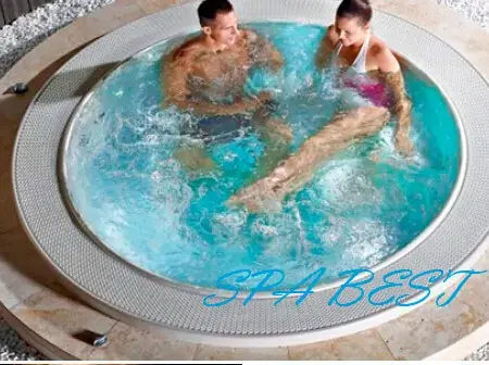 Изящное и выразительное сочетание мрамора бежевых тонов, белоснежной чаши джакузи и искрящейся голубой воды погружает в атмосферу роскоши и настраивает на спокойный лад.