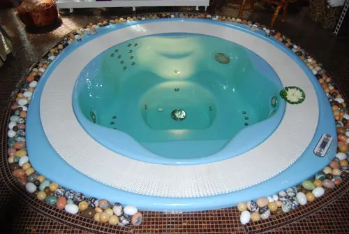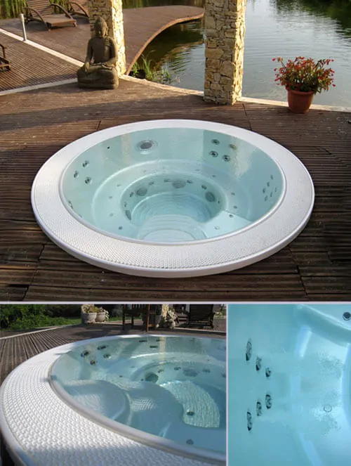 Круглый встраиваемый джакузи Relaxo Установка в подиум позволяет избежать сложных подготовительных работ. Бассейн стоит непосредственно на полу, а подиум создает иллюзию заглубленной установки и одновременно дает дополнительное место для напитков