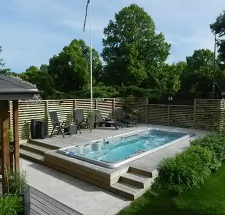 Подиум для уличного бассейна с противотоком Passion Spas с двух сторон закрыт не нескромных взглядом невысокой изгородью и зелеными насаждениями. Это создает дополнительную защиту от ветра в холодное время года.