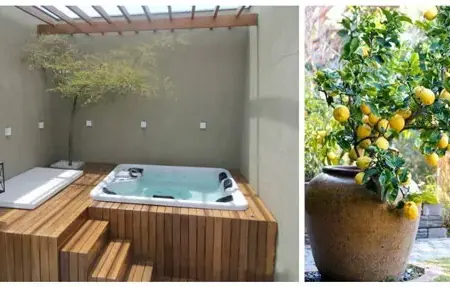 Подиум с широкой стороной, на которой можно удобно расположиться у воды, со ступенями для входа – отличное решение для небольшого патио или террасы таунхауса. Мини бассейн при этом стоит на полу, а удобный доступ к оборудованию находится за скрытым люком по длинной стороне. Большое лимонное дерево в керамическом вазоне – отличный вариант сеанса ароматерапии. Во время цветения все пространство вокруг заполняет восхитительный аромат цитрусов.