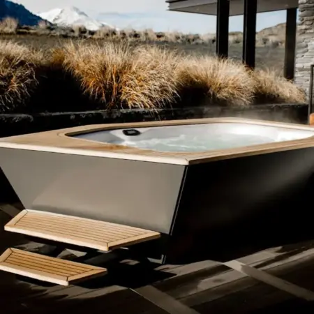 Уличный джакузи с подогревом в цветах осени. Именно так можно описать этот проект. Эта красивая модель джакузи для улицы не нуждается в сложном оформлении. Она достаточно хороша сама по себе. Все, что понадобилось владельцам спа бассейна — это заказать для нее подходящие по форме и цвету ступени. Дикорастущие злаки образуют эффектную естественную преграду, укрывающую зону релаксации от посторонних взглядов. Цвет серого камня, травы и наружной обшивки самого бассейна отлично дополняют друг друга.