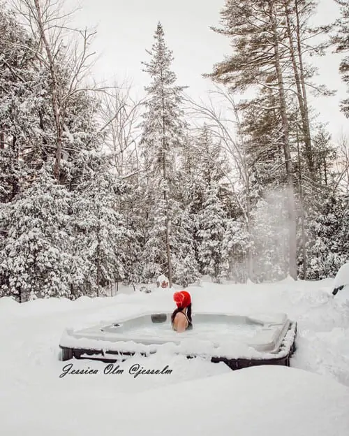 Jessica Olm and her apres ski hot tub in Adirondack Mountains Мини бассейн и база отдыха. Уличная ванна джакузи с подогревом возле коттеджа в доме отдыха или в небольшом загородном