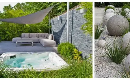 Простое и вместе с тем невероятно стильное оформление зоны отдыха. Серые тона гальки и натурального камня отлично рифмуются с зеленью газона. Уличный спа встроен рядом с террасой, крышку бассейна можно легко снять и прислонить к подпорной стенке. Легкий навес гарантирует тень в самые жаркие часы летнего дня.