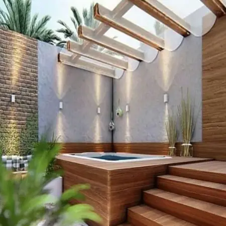 Легкий навес защищает зону спа от яркого солнца и тропических ливней