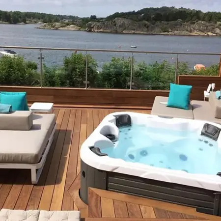 Еще одна красивая установка гидромассажного бассейна на террасе в Норвегии. Прозрачное ограждение позволяет в полном объеме сохранить главную достопримечательность. Речь идет про роскошный вид на воду и соседние холмы.