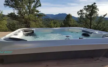 Частично встроенный в террасу спа является центром композиции уличной зоны отдыха. Прозрачная крыша беседки позволяет любоваться ночью звездным небом, одновременно наслаждаясь массажем и тихим плеском воды. Естественный уклон участка позволил поставить сам бассейн непосредственно на грунт, а за счет приподнятого пола террасы создается иллюзия частичного заглубления. Кроме того, такой способ установки позволяет обойтись без ступеней для входа в джакузи.
