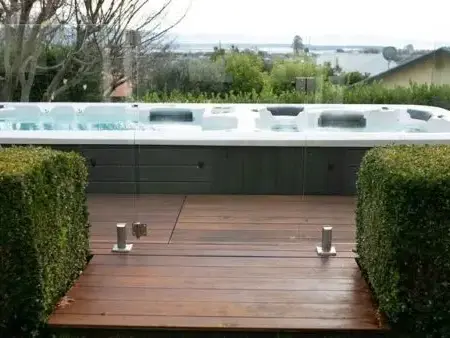 Терраса уличного спа бассейна с противотоком и доступ к оборудованию джакузи