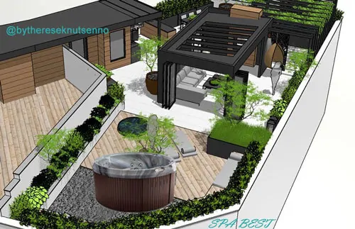 Уличная спа зона от Therese Knutsen Терраса с беседкой, джакузи с подогревом для уличного использования и зона отдыха в загородном доме. Мы позволили себе некоторую вольность в обращении с работой