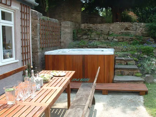 Ступени из камня Как поставить джакузи на террасе отеля. Недорого сделать площадку для уличного спа бассейна в гостинице. Мини бассейн с подогревом в глэмпинг. Проект, который отлично демонстрирует, что скромный