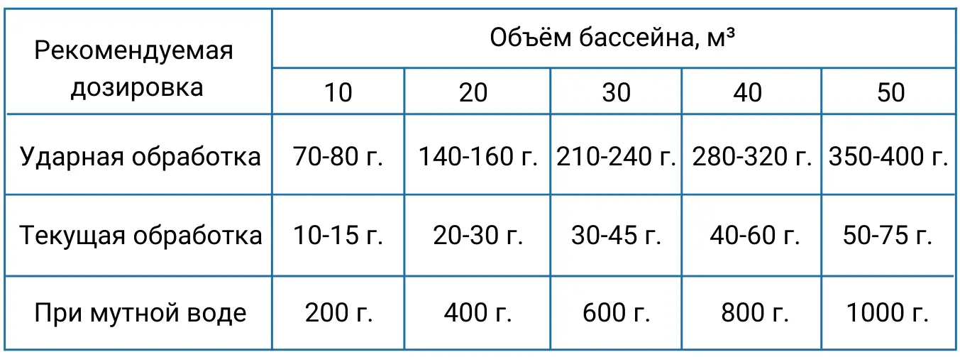 Для повышения уровня активного хлора на 0,1 мг необходимо добавить 2 г препарата 1м³ воды. В зависимости от качества воды, нагрузки на бассейн, типа фильтровального оборудования дозировка может быть как увеличена, так и уменьшена.