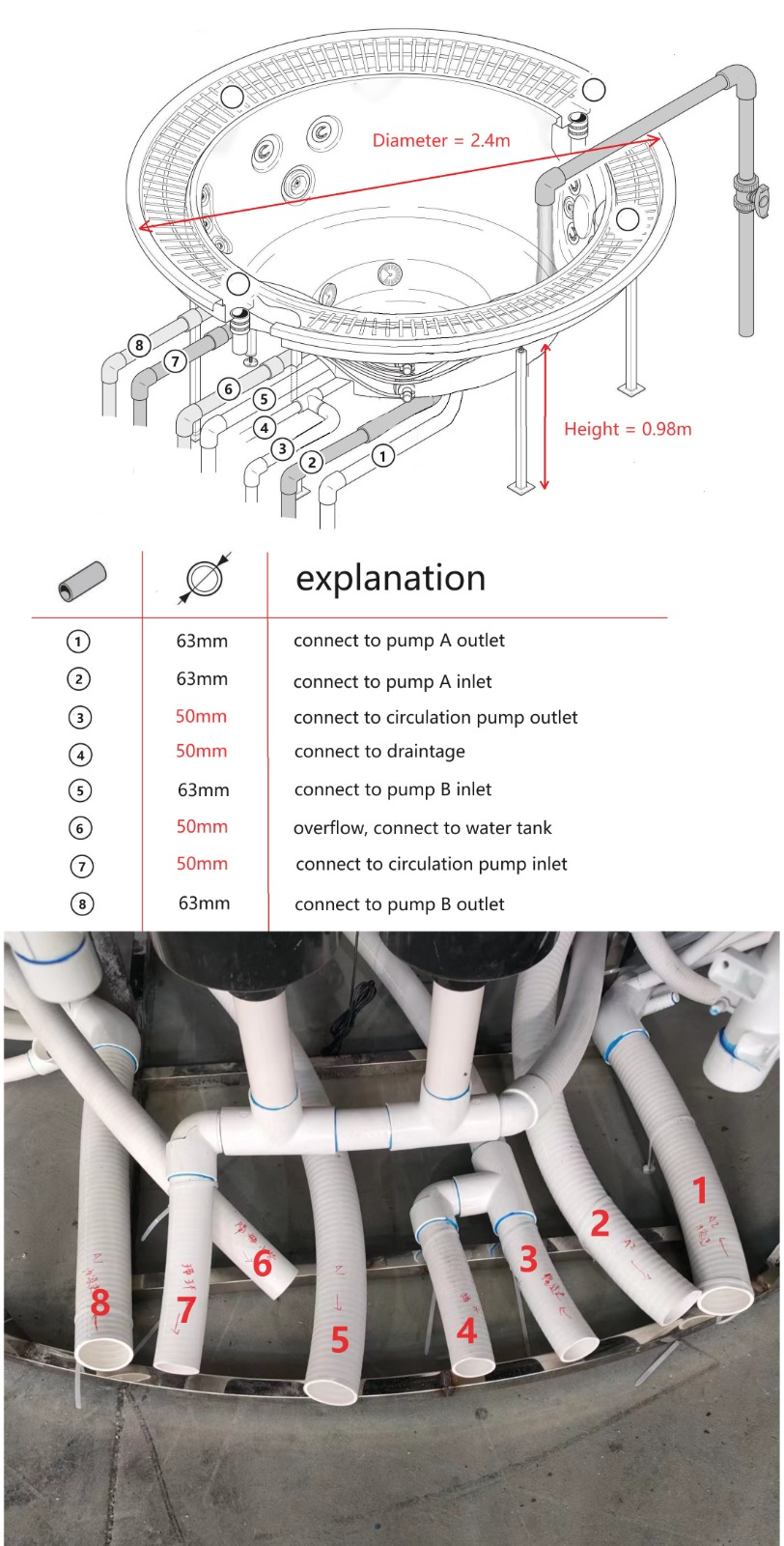 Комплект оборудования для Круглый переливной гидромассажный бассейн Atagava с переливной ресиверной емкостью подбирается техническими специалистами с учетом всех характеристик вашего объекта. Вы можете заказать песочный фильтр, станцию автоматического дозирования химических препаратов, озонатор и дезинфекцию воды ультрафиолетом. Для установки оборудования понадобится техническое помещение площадью примерно 3-4 кв.м. При этом расстояние до чаши переливного бассейна не должно превышать 7м. Круглый переливной гидромассажный бассейн спа Atagava получил название по известному термальному курорту в Японии. Переливной гидромассажный спа бассейн Atagava на 6 человек предназначена для профессиональных спа центров, фитнес клубов, отелей, загородных  клубов. Классический дизайн круглого джакузи идеально вписывается в самый сложный архитектурный проект. Разумеется, в нем есть все лучшее, что требуется от профессиональной переливной джакузи. Точно рассчитанный угол наклона спинки сидений, выверенная форма кресел. Плюс большое, хорошо организованное внутреннее пространство. Проектировщики Atagava оснастили каждый массажный шезлонг своим особенным кластером форсунок. Расслабленная поза и полный массаж всего тела – идеальная комбинация релаксации и интенсивного лечебного воздействия. Плюс ко всему, к 28 классическим гидромассажным форсункам добавлены 12 аэромассажных. Как итог, это дает еще более впечатляющий результат. Светодиодная подсветка теплого небесно-голубого оттенка.