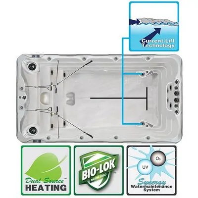 Длина этой модели плавательного джакузи имеет тот самый минимальный размер, позволяющий системе противотока эффективно работать. Компактность свим спа дает возможность устанавливать бассейн в небольших помещениях. Или на террасе загородного дома. Внутри бассейна можно размещать водные тренажеры. Например, аквабайк или классический тренажер для спортивной гребли.