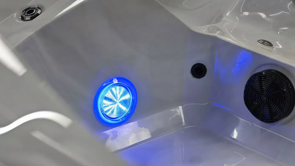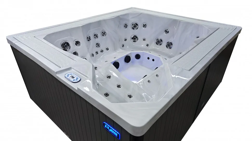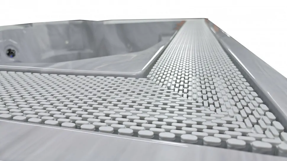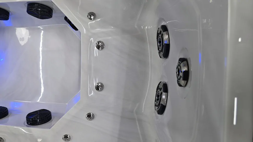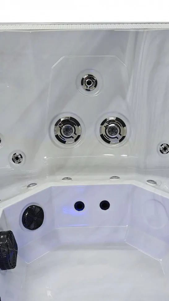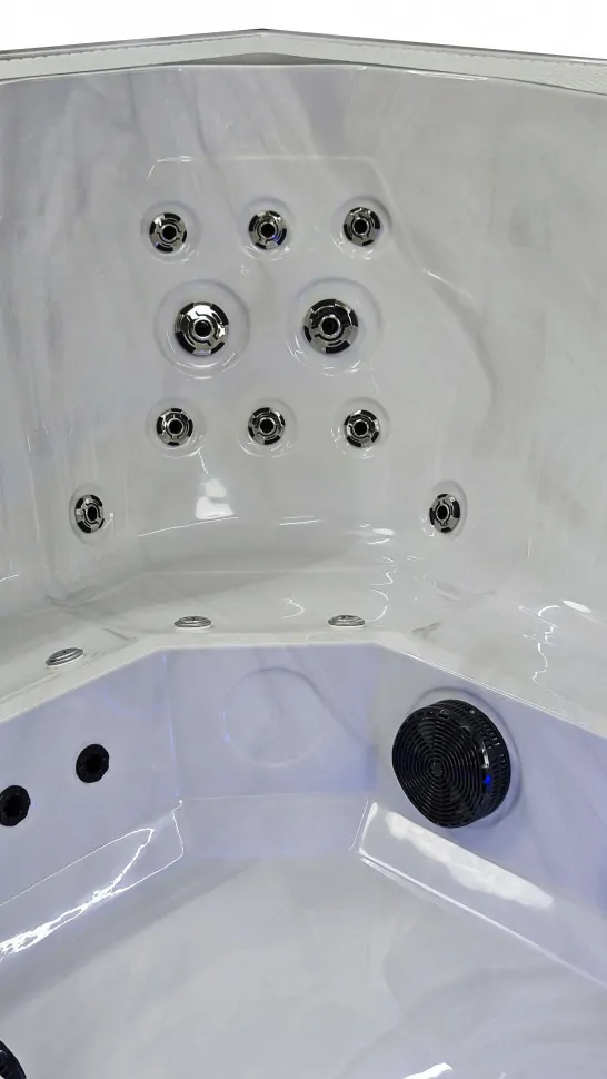 Внутренний объем спланирован в расчете на размещение шести человек. Отдельная программа гидромассажа предусмотрена на каждом из шести сидений. По короткой стороне джакузи расположен лежак шезлонг и удобная римская лестница для входа.