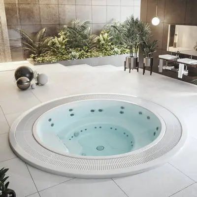 Корпус бассейна притягивает взгляд и безвозвратно пленяет своей красотой. Такая покупка несомненно увеличит функциональность спа центра отеля или загородного клуба. Чаша встроенного джакузи выполнена из акрила с металлическим несущим каркасом. Материалы гидромассажной переливной ванны соответствуют всем современным стандартам прочности, экологичности и интерьерной моды. Размеры ванны рассчитаны на инсталляцию в большом пространстве. Именно поэтому такие бассейны особенно часто приобретают отели, фитнес центры и другие коммерческие объекты.